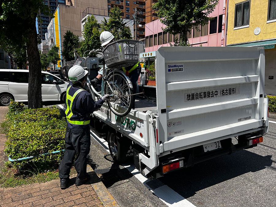 名古屋市の駅前に放置された自転車を撤去回収し保管場所へ搬入する事業です。約30年間継続し町の安全安心に貢献しています。